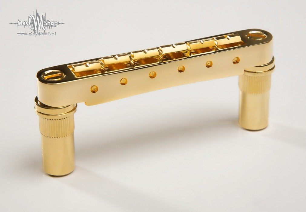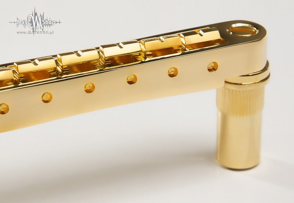 - Mostek typu tune-o-matic wykonany (łącznie z kostkami) ze stopu RESOMAX, poprawiającego naturalny rezonans akustyczny instrumentu. Posiada system AutoLock. Na zdjęciu ukazany w złotym wykończeniu.