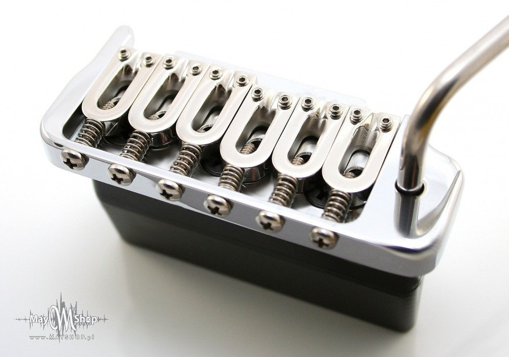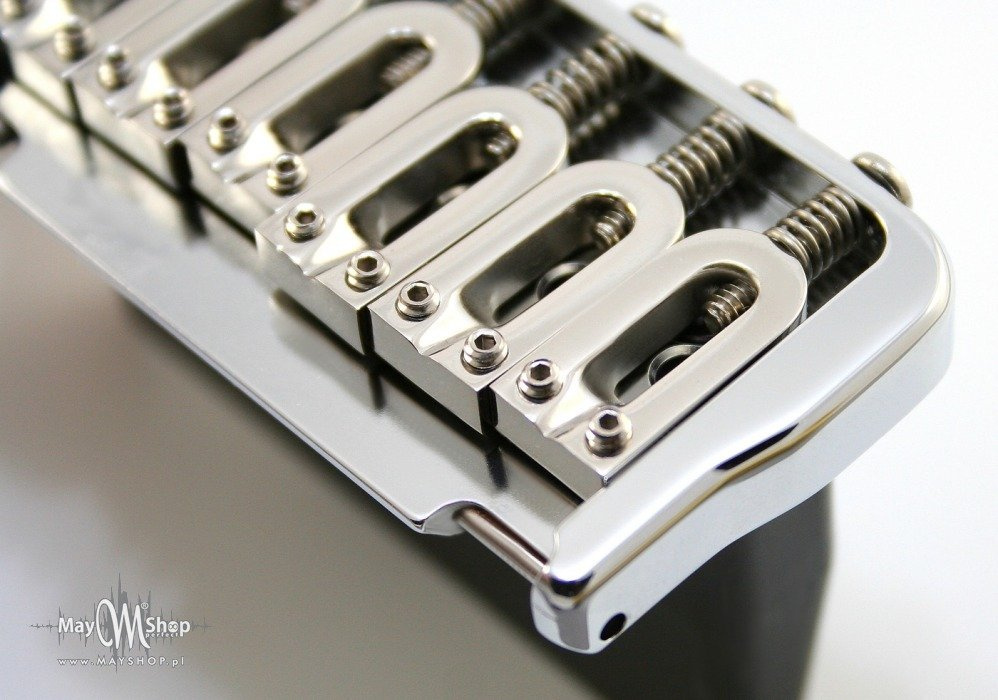 - System nośny („ostrza”) podstawy mostka wykonany z wyjątkowo twardej stali zapewnia doskonałe trzymanie stroju, długi sustain oraz trwałość konstrukcji. Na zdjęciu pokazany w czarnym wykończeniu.